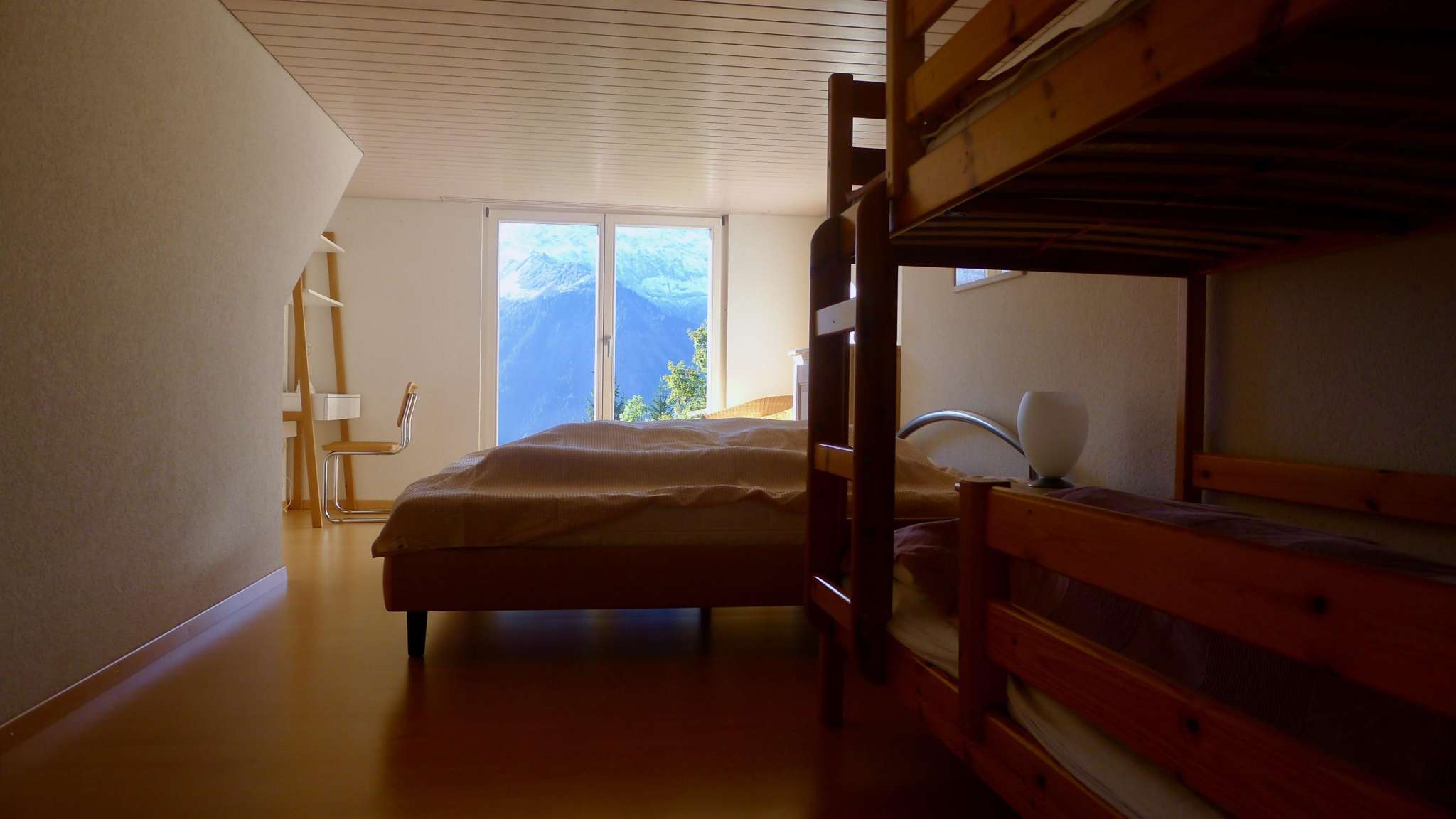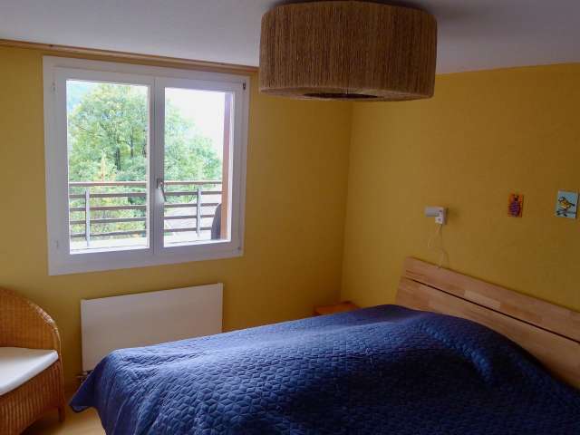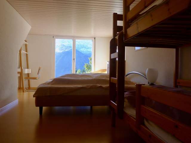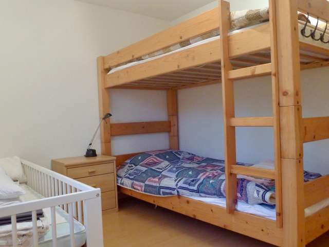 Die Wohnung eignet sich insbesondere für mehrere Familien, Generationen oder Freunde, die gemeinsam Ferien machen wollen. Die beiden grossen Zimmer im unteren Stock bieten dank eigenem En suite-Bad und Zugang zum Garten viel Privatsphäre. Oben befindet sich das grosse, helle Wohnzimmer mit Cheminée sowie zwei weitere Schlafzimmer und ein Bad.