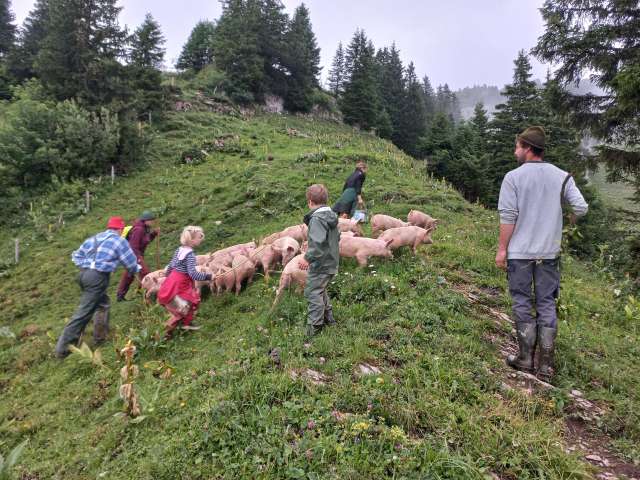 Ja, auch die Schweine bewältigen die Reise zum Oberstafel und auch zurück zu Fuss. Da Schweine nicht schwitzen können, ist nicht jedes Wetter für den Marsch geeignet. Wenn möglich wählen wir einen regnerischen oder zumindest bedeckten, nicht zu heissen Tag aus oder sonst nehmen wir den Marsch früh morgens bei Tau in Angriff. Sobald sich die Tiere ein paar Meter vom Gebäude entfernt haben und in die Gänge kommen, ist der Aufstieg/Abstieg eigentlich kein Problem mehr. Es ist einfach wichtig, dass man nicht zu schnell läuft und zwischendurch auch mal eine Pause einlegt. Wenn alle Stricke reissen, so kommt auch Mal eine Meisse zum Einsatz. Nach den fünf Wochen im Oberstafel geht die Reise wieder zu Fuss nach unten. Dann sind die Schweine schon etwas schwerer und sollte eins den Weg nach unten nicht mehr schaffen, so wird es in einer Kiste auf den Hornschlitten geladen. Aber das ist zum Glück nicht jedes Jahr der Fall.