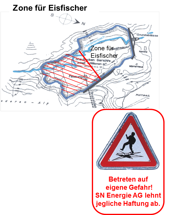 Die Eisfischerei im Garichtestausee ist patentpflichtig. Die Eisfischerei ist jeweils vom 15. Januar bis zum 28./29. Februar gestattet. Die Eisfischerei ist nur auf dem vorderen Seeteil bis zur Markierung (rote Punkte) gestattet. Das Betreten der Eisfläche geschieht auf eigene Gefahr, bei Unfällen wird jegliche Haftung abgelehnt. Das Betreten der Eisfläche ist nur bei Tageslicht gestattet. Die Löcher zum Eisfischen dürfen nur mit dazu spezialisierten Eisbohrern gemacht werden. Den Weisungen des Personals der SN Energie ist Folge zu leisten. Auf der Eisfläche sind keine Gegenstände oder Abfälle zu hinterlassen. Es ist Rücksicht auf andere Benutzer (Taucher) zu nehmen.