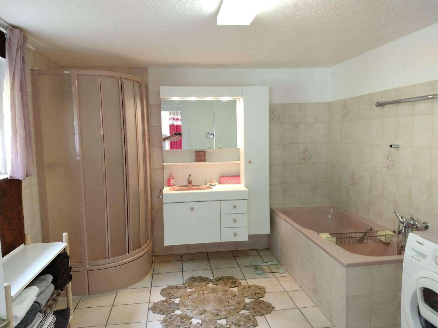 Badezimmer: mit WC, Badewanne, Waschbecken und Dusche.
