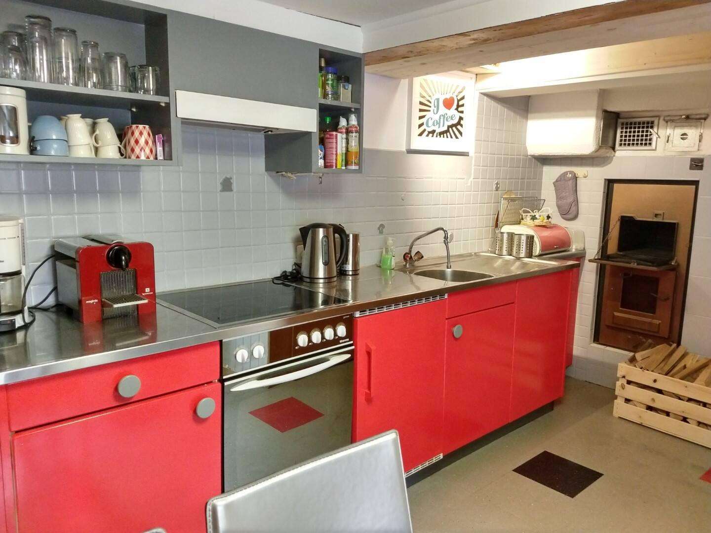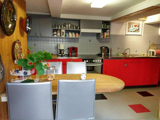 Küche: mit Essbereich, Kühlschrank, Gefrierschrank, Herd, Geschirrspüler und Holzherd.