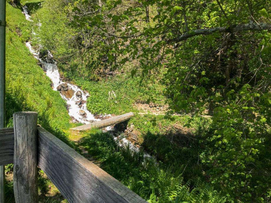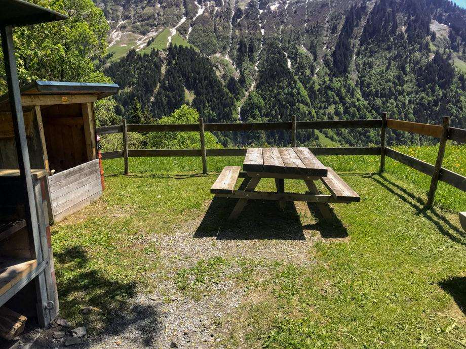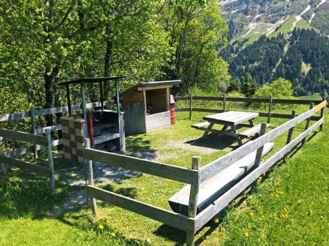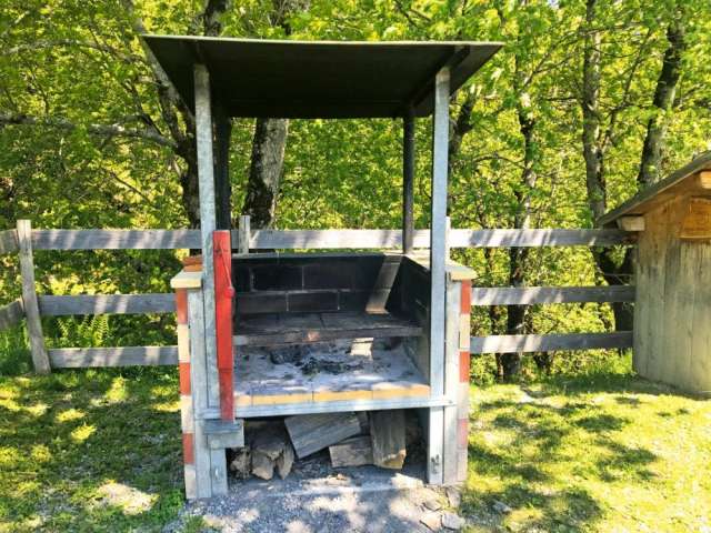 Die umzäunte Feuerstelle verfügt über einen gemauerten Feuerherd und liegt am Rand einer Baumgruppe. Einige Schritte daneben fliesst ein Bach vorbei, auf der anderen Seite eröffnet sich der Blick in die Bergwelt. Feuerholz findet man vor Ort ebenso wie einen Abfalleimer. Da die Feuerstelle eher klein ist, eignet sie sich nur für wenige Leute.