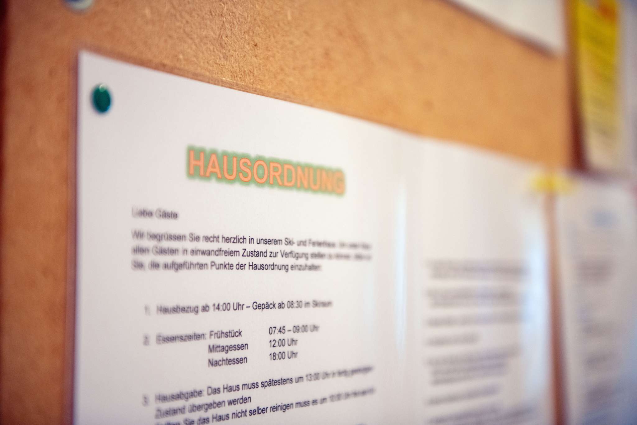 Räumlichkeiten: Ess- und Aufenthaltsraum für ca. 70-80 Personen, Spielraum mit Tischtennis und Tschüttelikasten, Skiraum, Garderobenraum, Separate Clubstube für ca. 30 Personen, moderne Küche, grosse Balkone/Terasse, 2 grosse Waschräume, 4 Duschkabinen. Schlafräume: 5x 4er Zimmer, 1x 6er Zimmer, 3x 8er Zimmer, 1x 10er Zimmer, 1x 12er Zimmer, 2x 14er Zimmer. Küchenausstattung: 4-Plattenherd, Kippbratpfanne, 2 Backöfen, Kühlschrank, Gefriertruhe, Geschirrwaschmaschine.