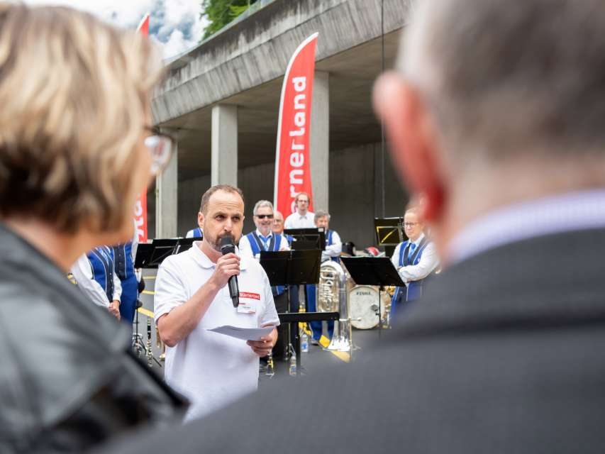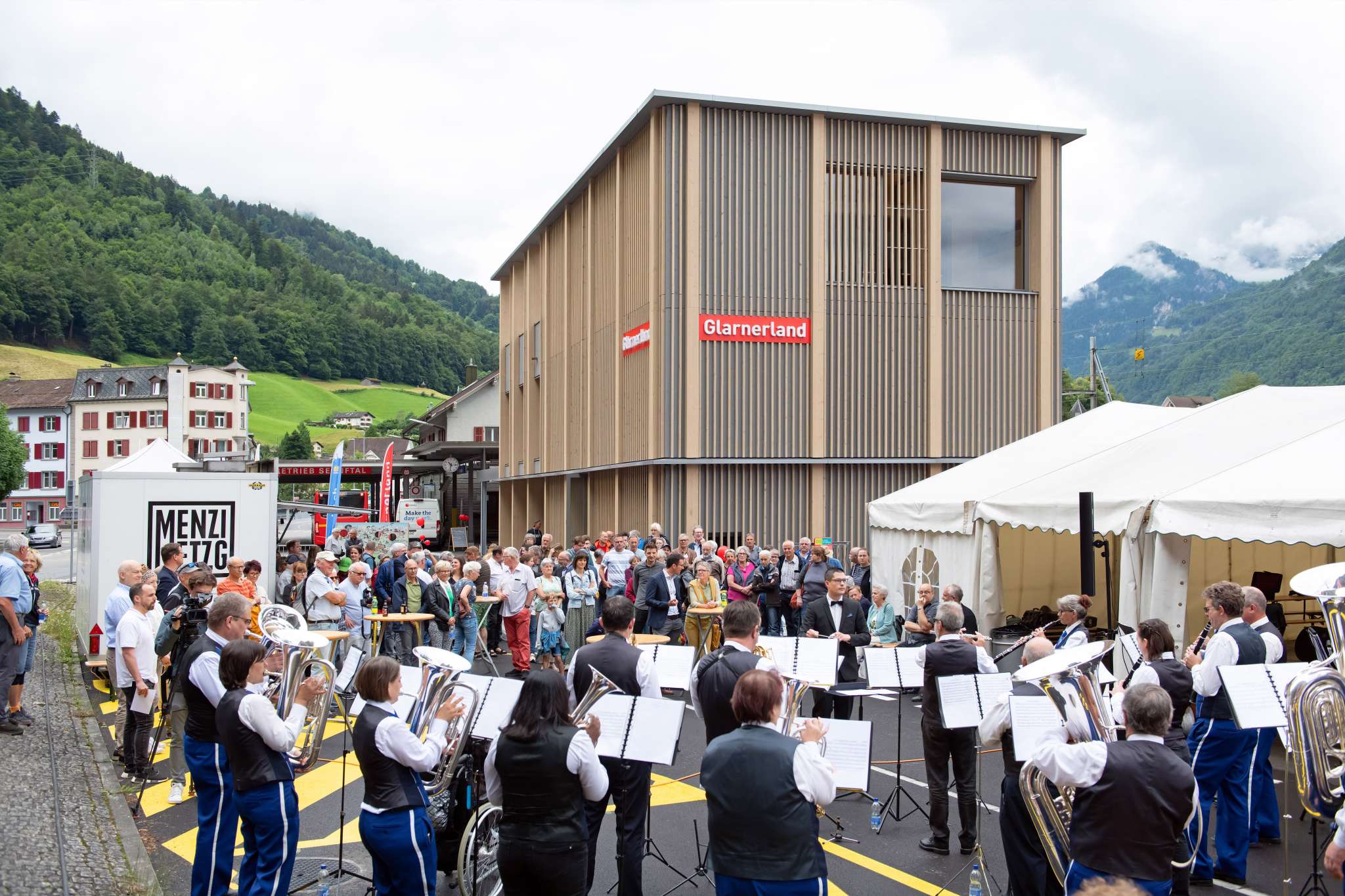Zahlreiche Gäste aus Tourismus, Politik und aus der Bevölkerung liessen es sich nicht nehmen den neuen Bau zu Begutachten und sich am attraktiven Rahmenproramm, organisiert von der Gemeinde Glarus Süd und durch VISIT Glarnerland zu erfreuen. Standortförderer Christian Marti von der Gemeinde Glarus Süd führte gekonnt durch die festliche Eröffnungsfeier, die musikalisch von der Harmoniemusik Schwanden begleitet wurde.
