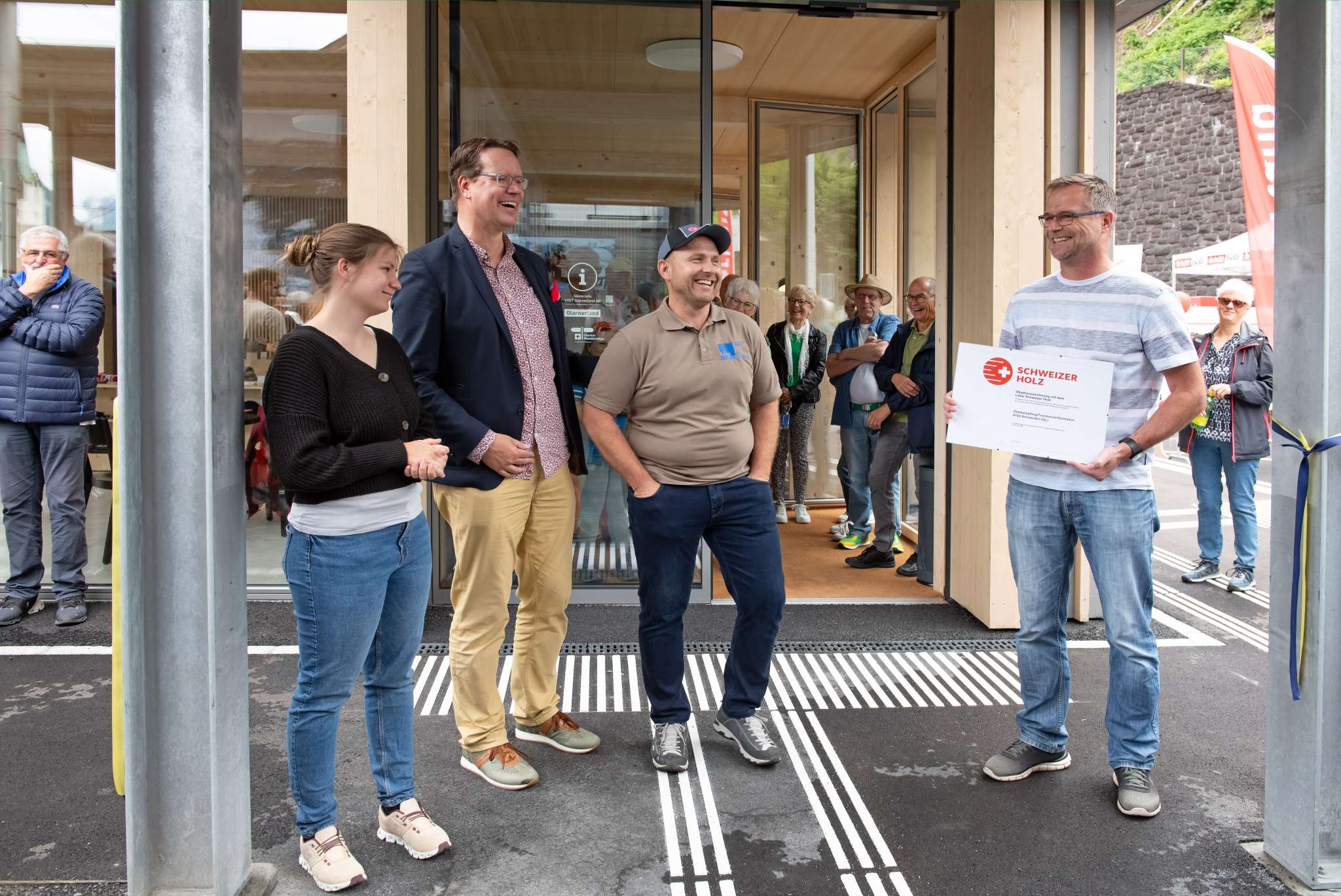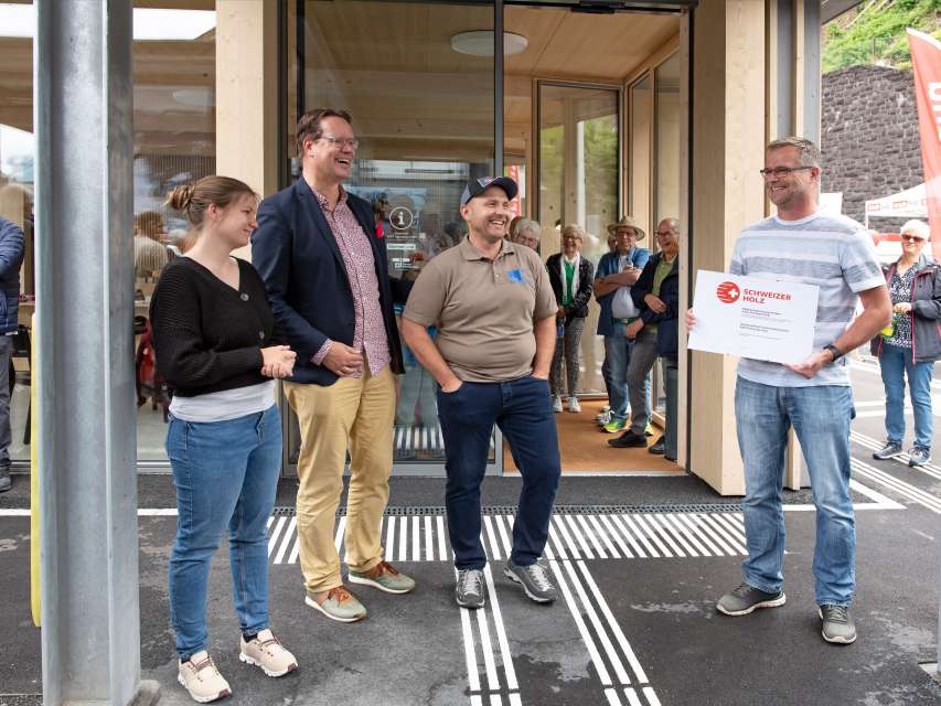 Nach dem das Band durchschnitten und die Tourismus Drehscheibe offiziell eingeweiht war, durfte Martin Hefti, Abteilungsleiter Liegenschaften der Gemeinde Glarus Süd von Thomas Tschudi Geschäftsführer von Lignum Holz Glarnerland das Label «Schweizer Holz» in Empfang nehmen. Thomas Tschudi strich hervor, dass praktisch alles Holz für den Bau aus einheimischem Wald und der Grossteil davon aus der Gemeinde Glarus Süd stamme. Anschliessend wurden die Räumlichkeiten zur Besichtigung freigegeben, was die vielen Besucherinnen und Besucher erwartungsfroh in Anspruch nahmen.