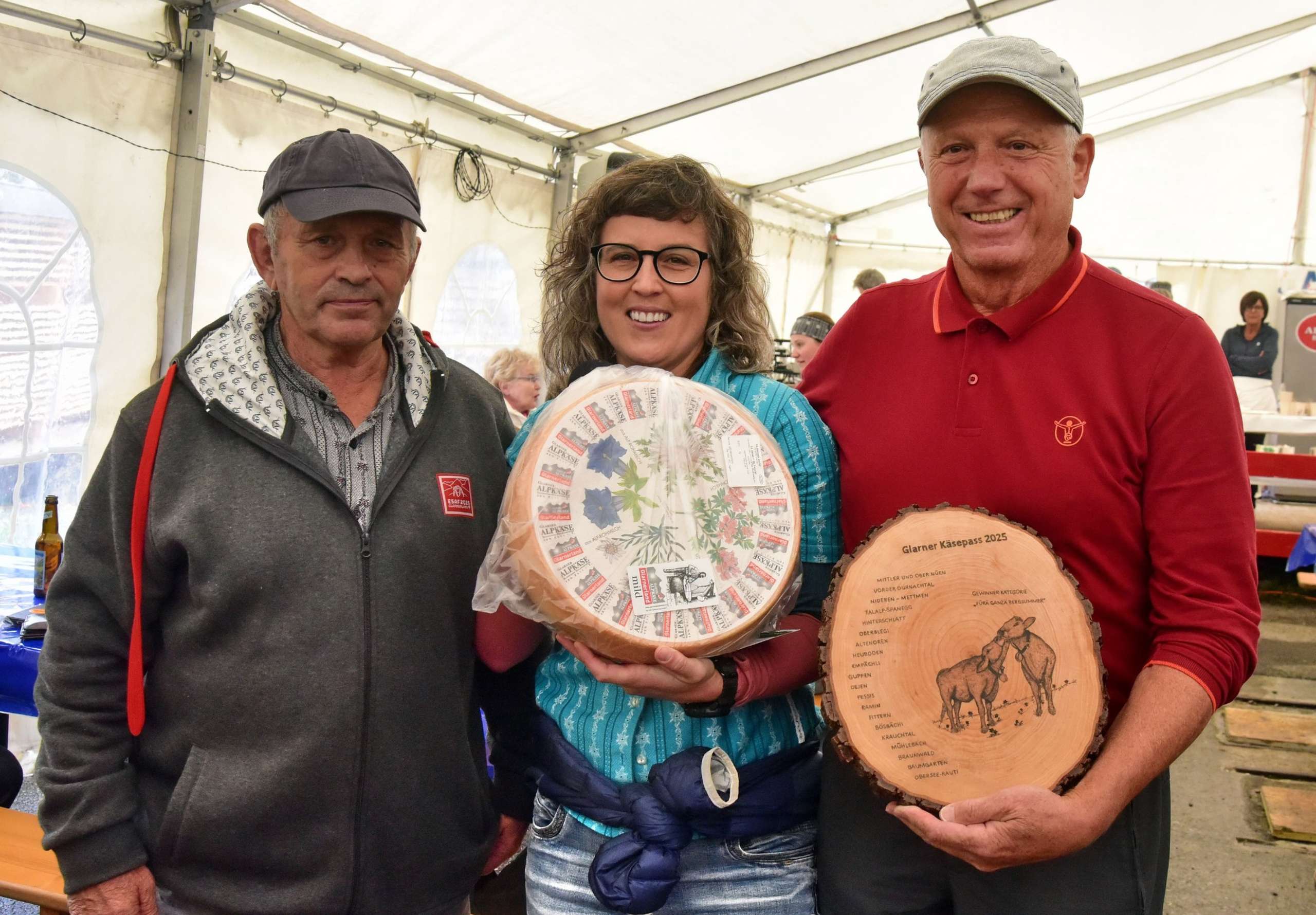 Im Bild: Der Gewinner des Glarner Käsepasses 2025 Karl Mächler (rechts), flankiert von Maya Rhyner (Team Agrotourismus) und Köbi Schnyder (Speaker). Bild © Ruedi Kuchen